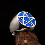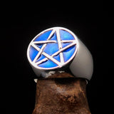 Solid Sterling Silver Men's Symbol Ring Blue Pentagram high polished with Enamel. The Ring is hallmarked 925 and has a solid Back.