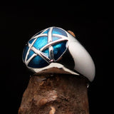 Excellent crafted Men's Pinky Ring domed Blue Pentagram - Sterling Silver