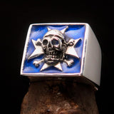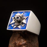 Solid Sterling Silver Men's Pirate Skull Ring Maltese Cross high polished with Blue Enamel.. The Ring is hallmarked 925