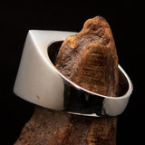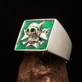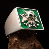 Solid Sterling Silver Men's Pirate Skull Ring Maltese Cross high polished with green Enamel.. The Ring is hallmarked 925