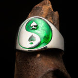 Grüner Pik-Yin-Yang-Pokerring aus massivem Sterlingsilber für Herren, hochglanzpoliert mit Emaille. Der Ring ist mit 925 gestempelt.